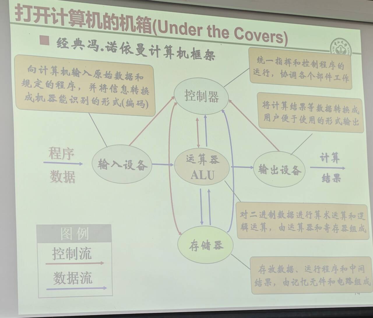 - 输入设备、输出设备、运算器(运算器+寄存器)、控制器(指挥协调)、存储器(记忆元件+电路)。