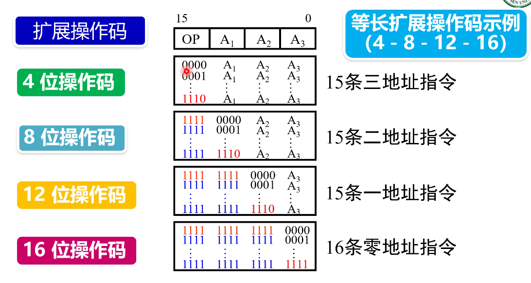 - 零地址指令:先用 1111,1111,1111 占位,然后第四个四位 0000~1111