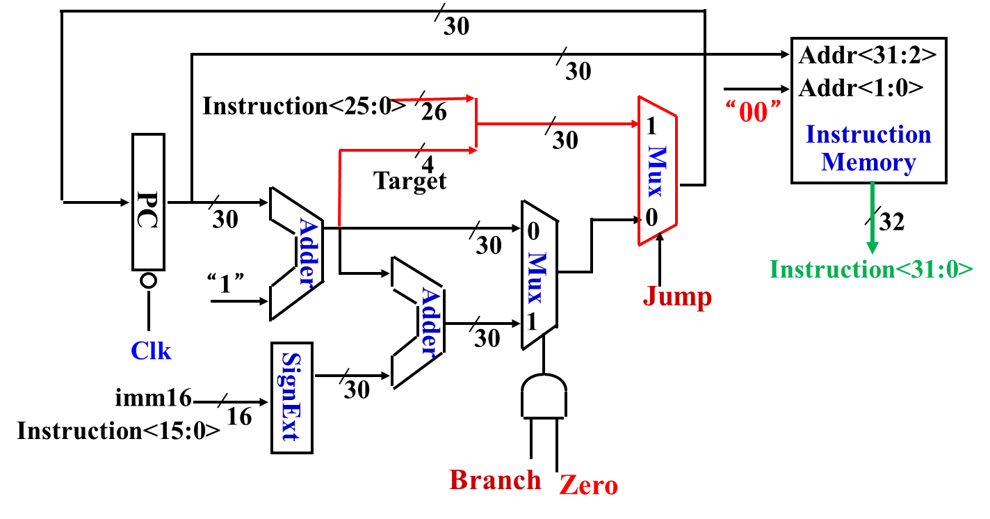 PC <- PC + 4 | PC[31,2],1 -> Adder -> PC | Adder 存在计算延迟 |