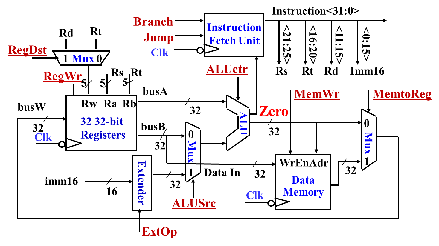 | RegWr | Register Write | 控制寄存器堆写操作 | =1 时将数据写回寄存器 |