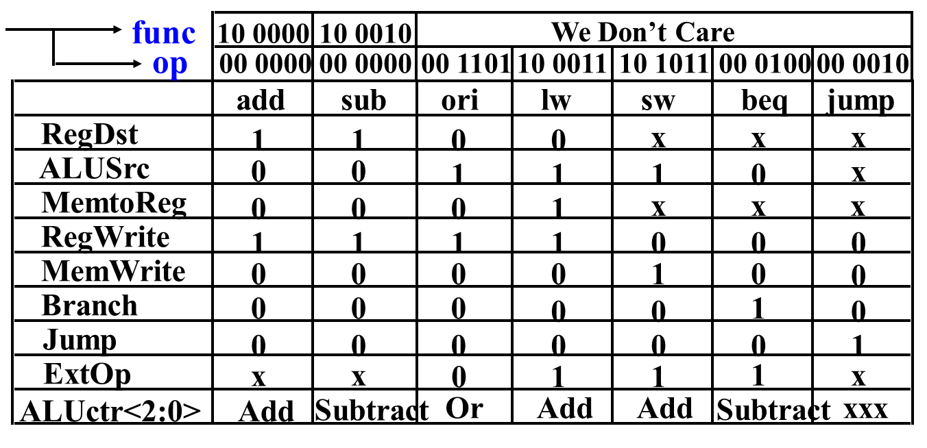 指令与控制信号逻辑关系表:用组合逻辑来实现。