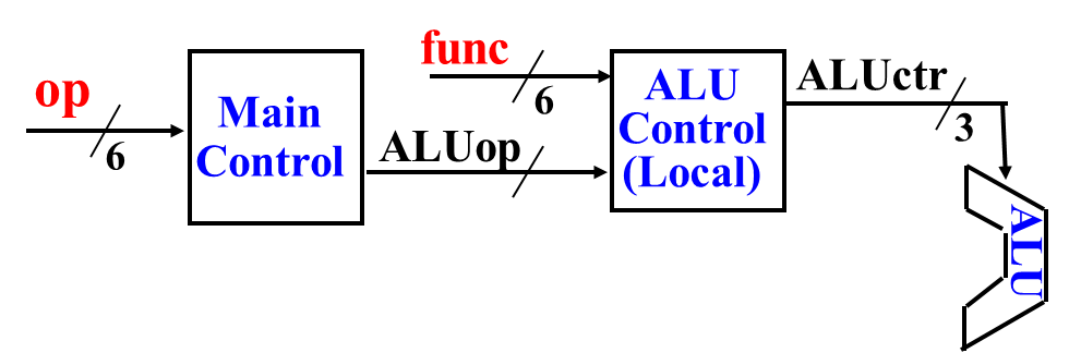 op:指令高六位,决定指令类型func:R 型指令最低六位,决定具体操作op -> MainControl -> ALUop:输出中间信号,告诉 ALU 控制器大概要做什么操作func,ALUop -> ALUControl -> ALUctr:最终信号,告诉 ALU 执行什么操作