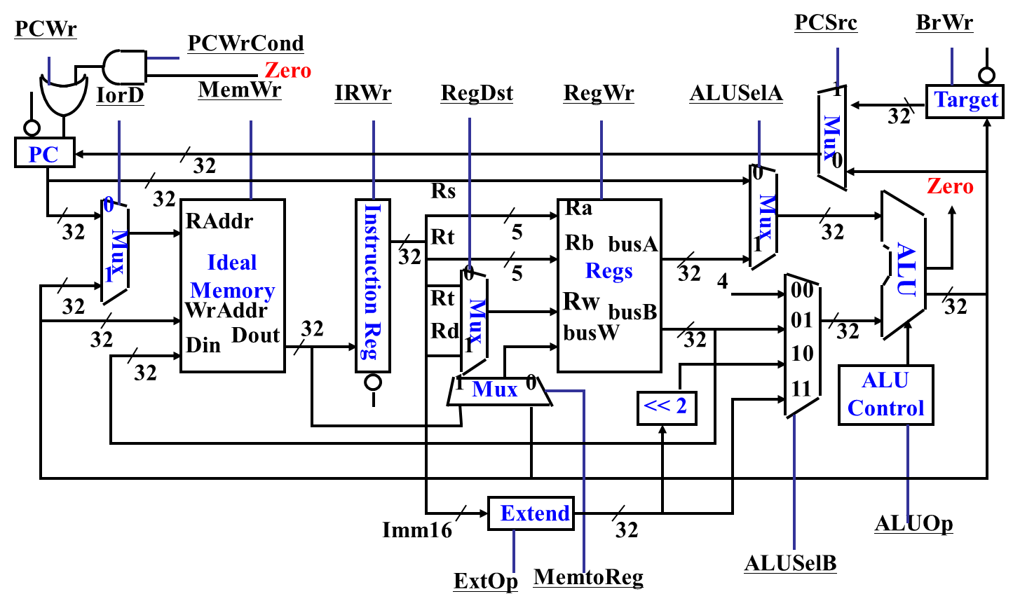 | IorD | Instruction or Data | 选择 Memory 地址来源 | 0→PC(取指),1→ALU 输出(数据访存) |