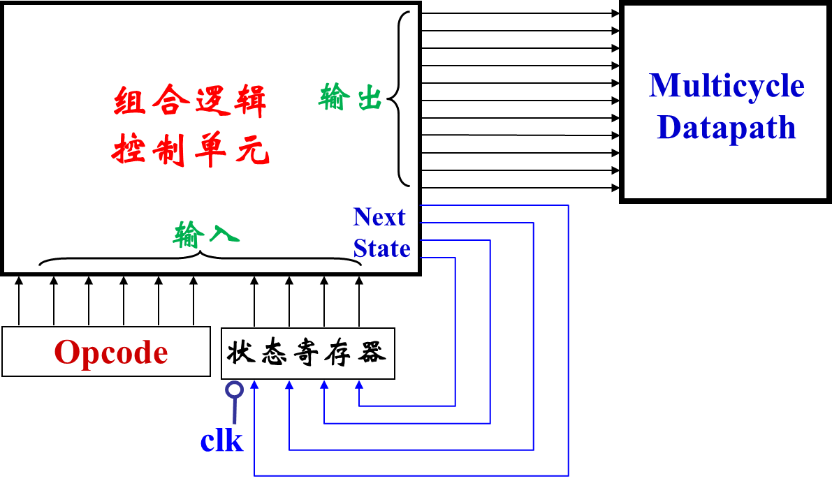 时序控制;由时钟、当前状态、操作码确定下一个状态,不同状态输出不同控制信号值。