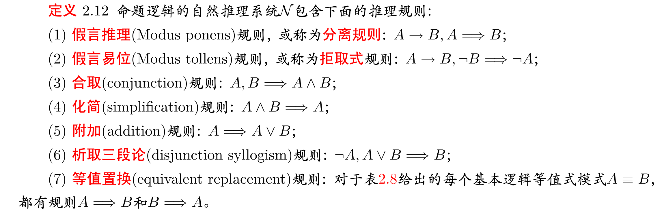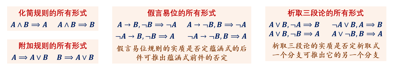 推理规则:简单有效推理的泛化,得到的 推理模式。(永真式的替换实例) #记忆
